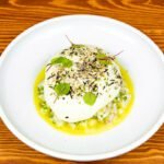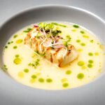 Cevice made with fish of the day , cauliflower , coliander, chives , ginger , curry oil , green apple , chiffon with jalapenos.