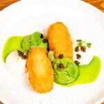 Cod Croquette with mashed potatoes , garlic dip and tartar mayonnaise.