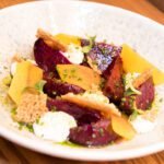 Colourful Beetroots , orange , honey bars with sesame , fresh herbs and xygalo cheese from Sitia.
