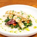 Octopus with Potatoes in large cubes, Chorizo, Lime, ‘Gremolata’ herb Sauce and Potato Cream.