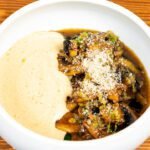 Seasonal Mushrooms with garlic puree , onions , baby gem lettuce , lime and hazelnut sabayon.