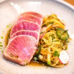 Tuna Tataki served with a vegetable salad , pickled jalapenos and a soy dressing.